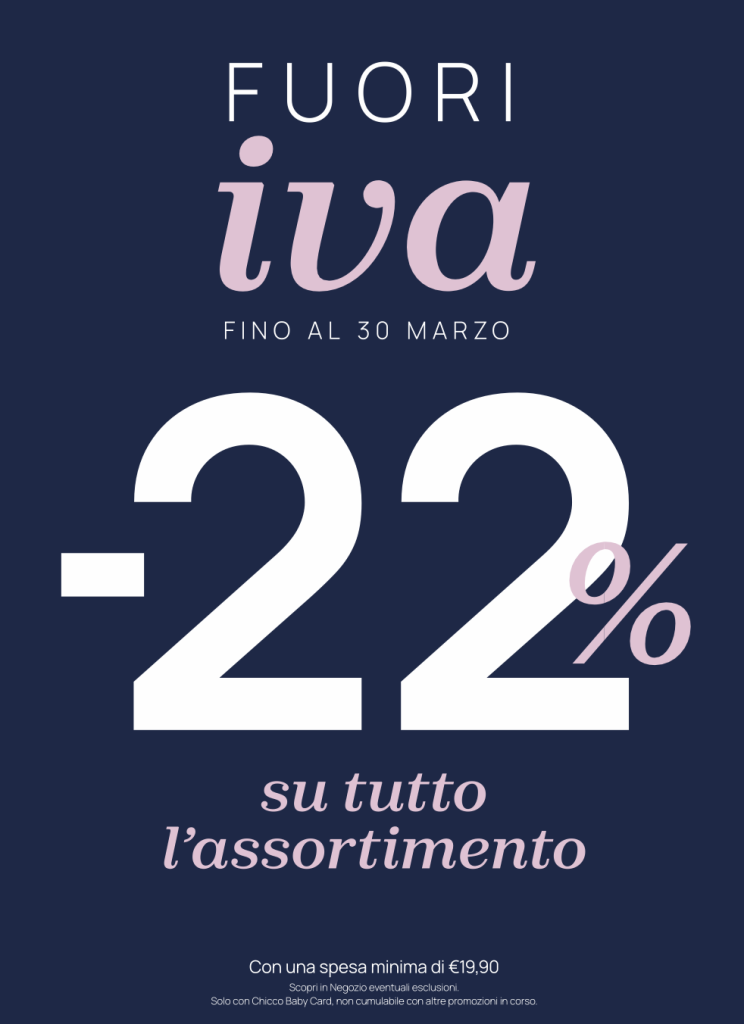 È il momento giusto per fare scorta di tutto ciò che serve ai più piccoli: da Chicco arriva il FUORI IVA, -22% su tutto l’assortimento con una spesa minima di €19,90.