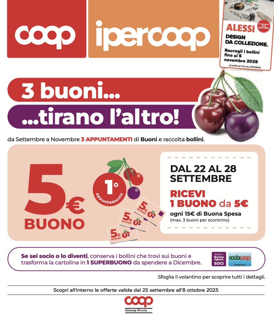 Vieni a trovarci da Ipercoop! 👉 Dal 22 al 28 settembre ricevi 1 buono da 5€ ogni 15€ di Buona Spesa.